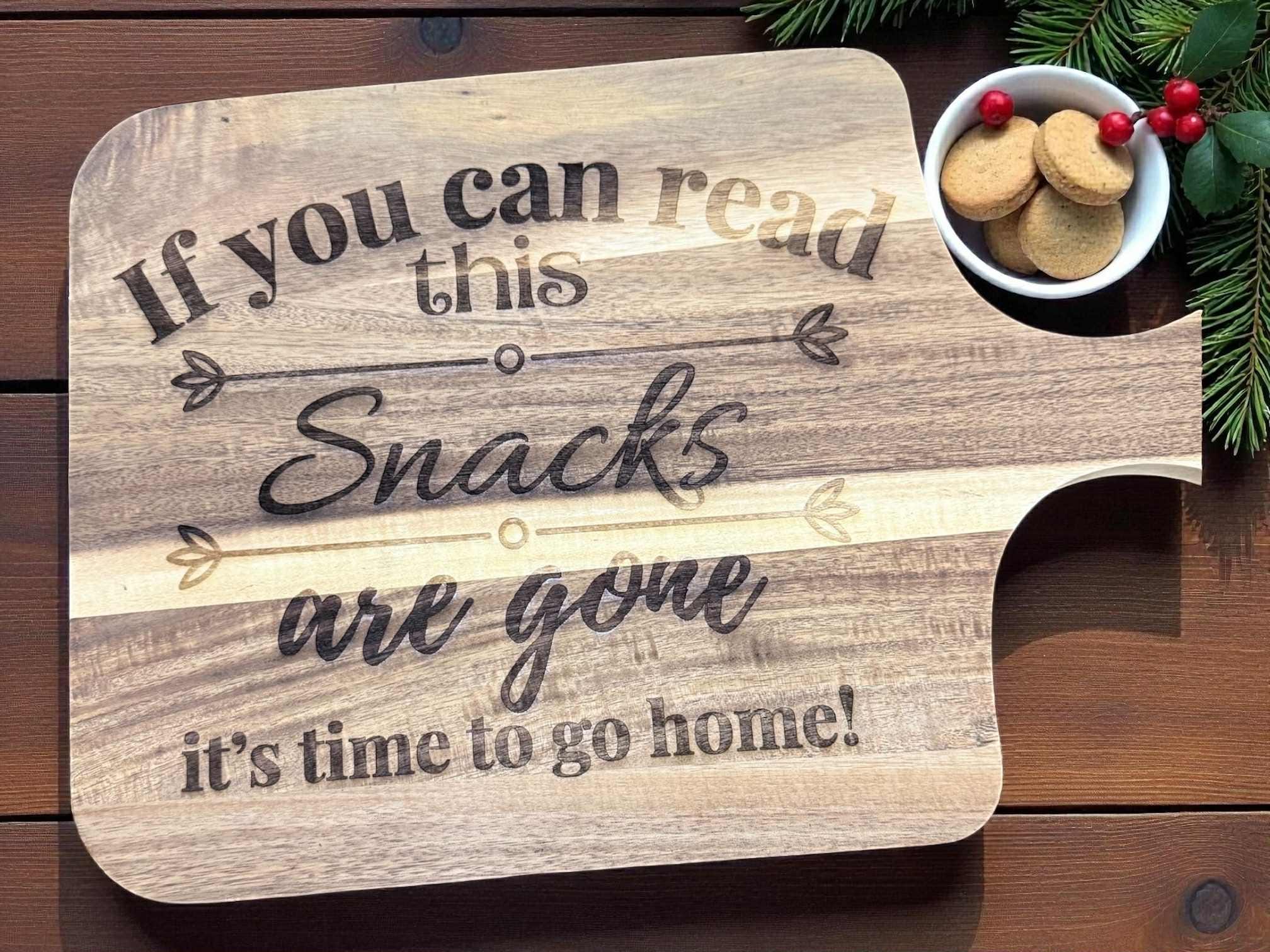 Bring humor and charm to any gathering with beautifully engraved wooden serving boards! Featuring t playful quotes like this: