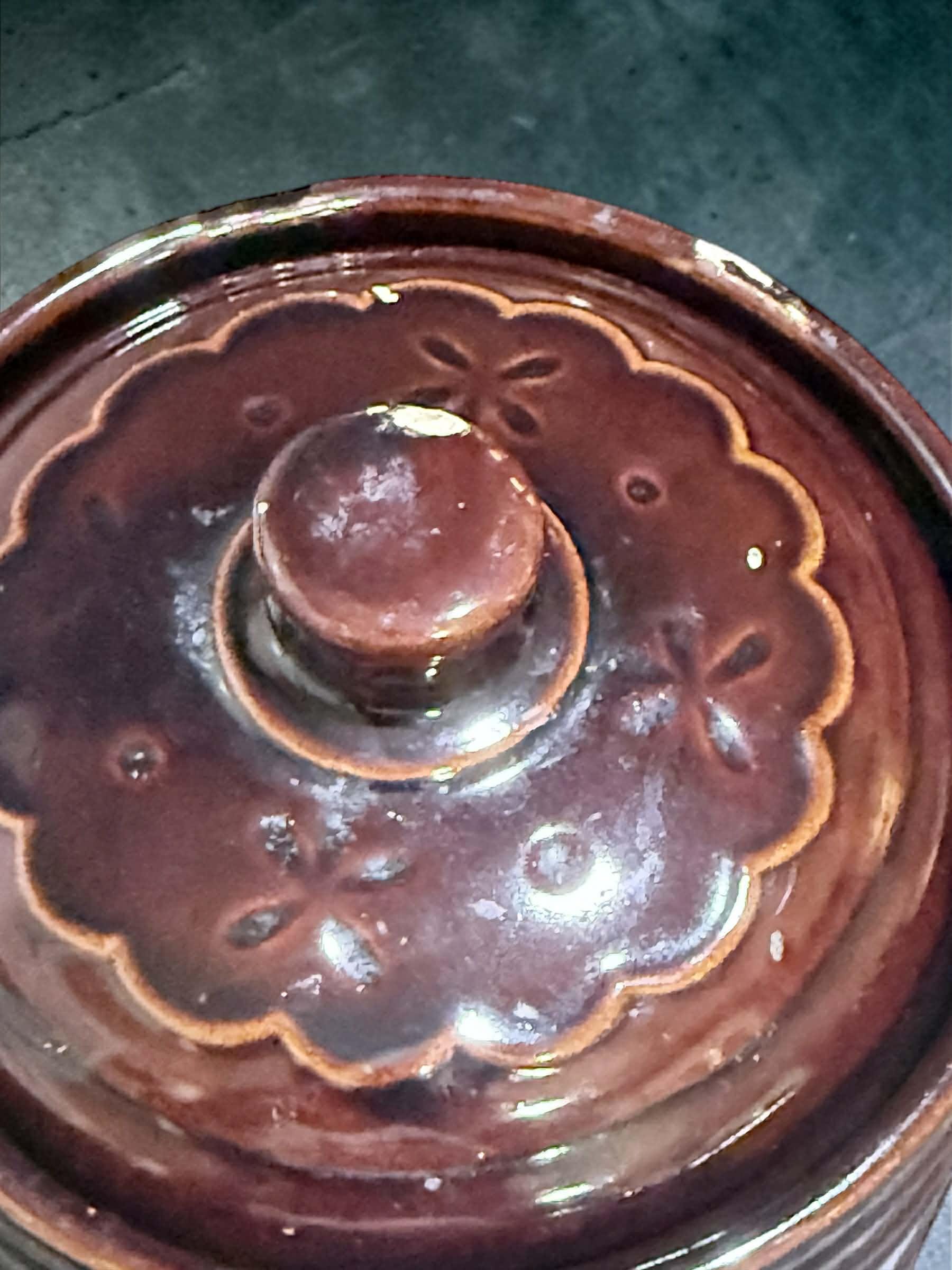 This classic mid-century piece features a rich brown glaze with an embossed daisy dot pattern, making it both functional and a standout décor item. A true staple of vintage American kitchenware!