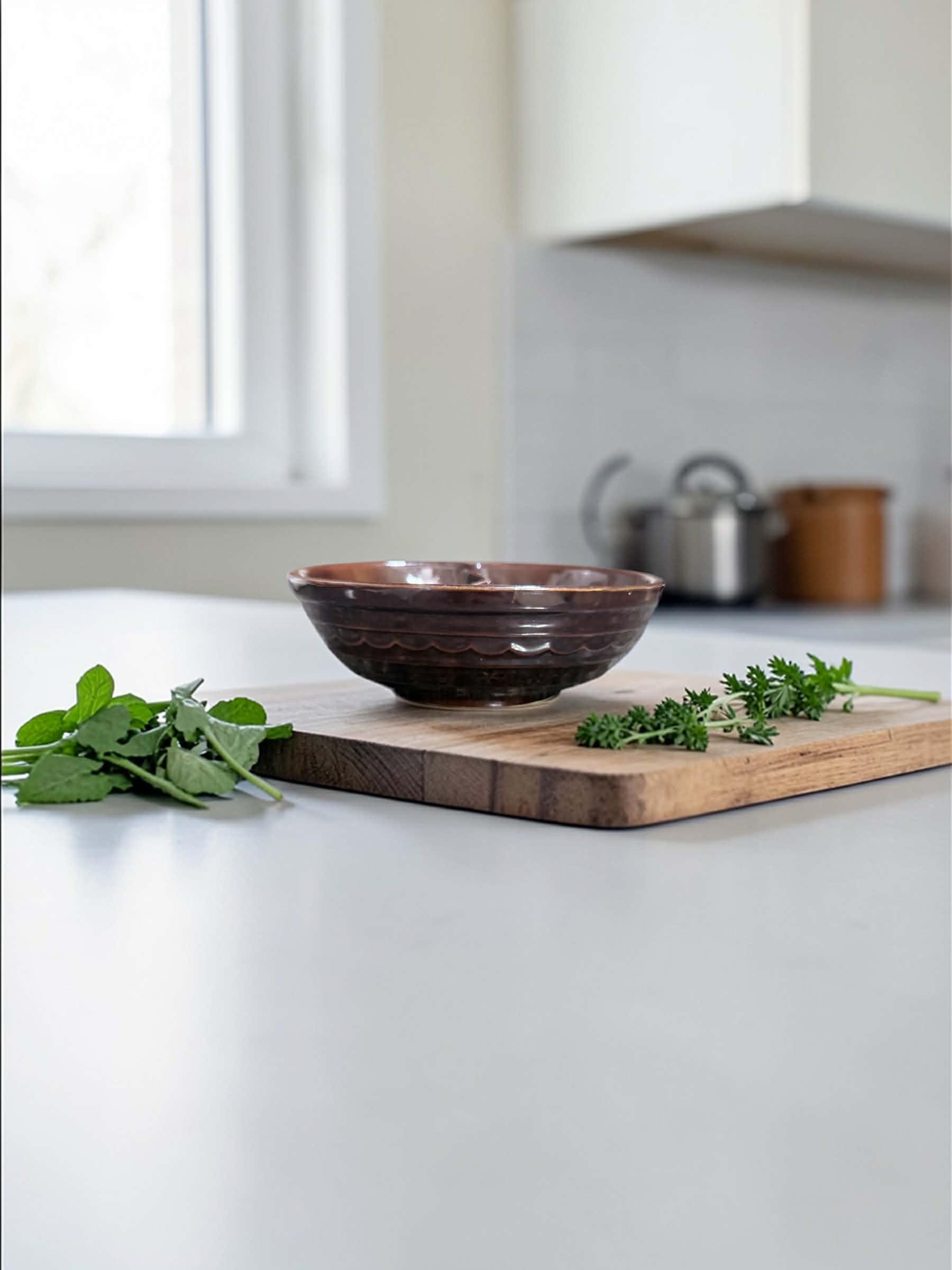 Featuring a rich brown glaze and built-in divider, this mid-century stoneware piece is perfect for entertaining or everyday use. Its timeless design adds warmth and rustic charm to any kitchen or table setting.