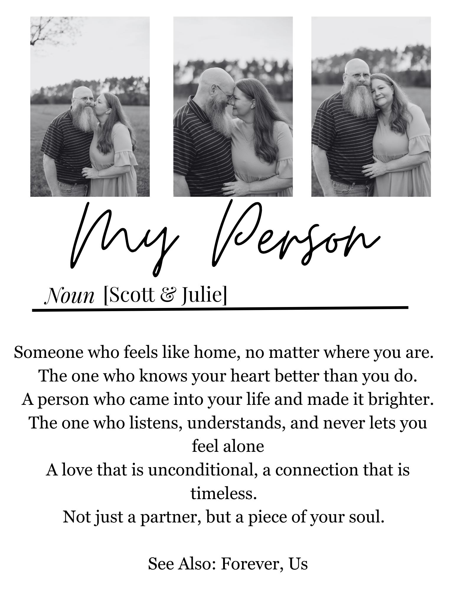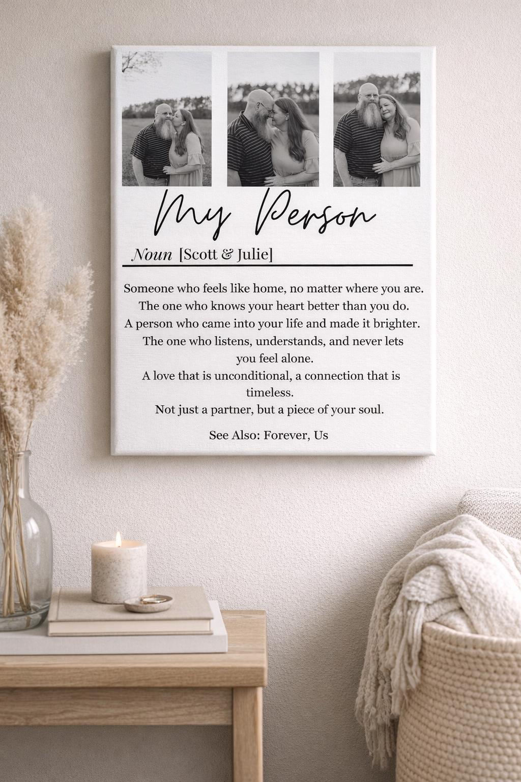 This editable âMy Personâ definition print is a heartfelt, personalized piece of wall art that captures love, connection, and everything in between. Perfect for anniversaries, weddings, or just because â this design lets you turn your favorite memories into something truly special.