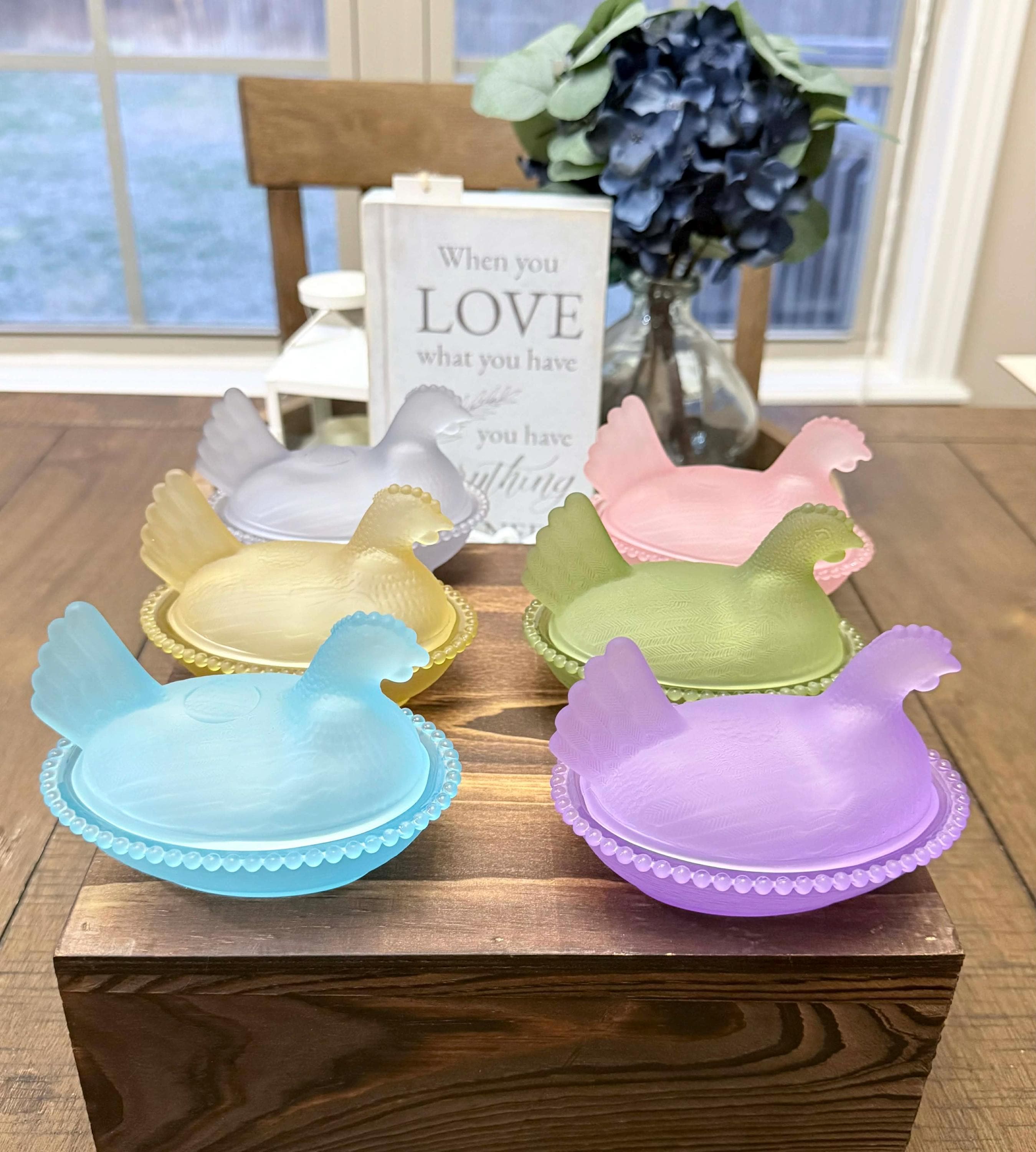 Beautiful smoke gray hen on a nest glass dish measuring approximately 4 inches. This piece features a soft frosted finish with delicate detailing on the feathers and a beaded edge base. A charming addition to any farmhouse, vintage, or cottage-style décor.