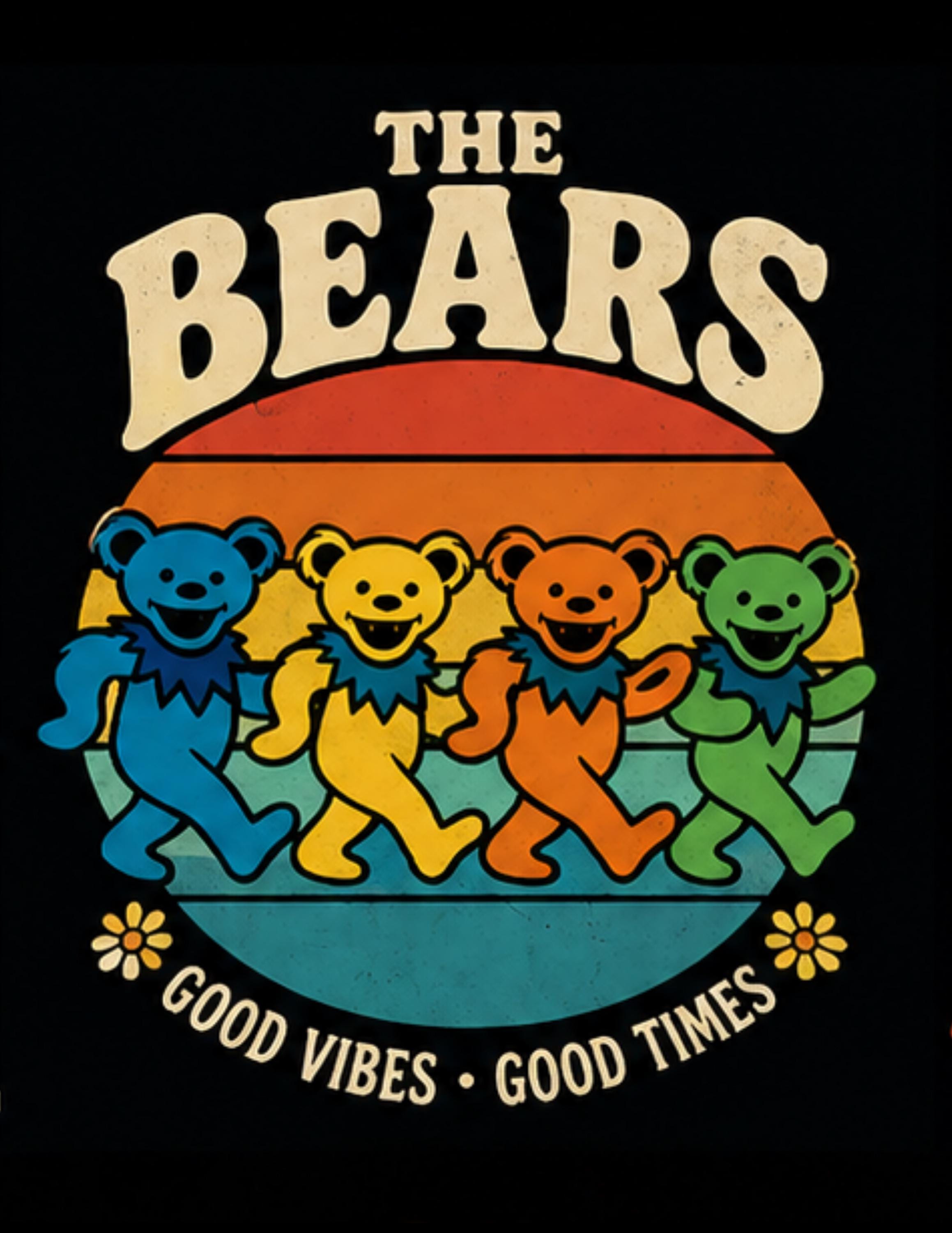 This retro-inspired dancing bears design is perfect for creating shirts, sweatshirts, tote bags, and more! Featuring a vintage sunset and colorful bears, this design gives off fun, nostalgic, hippie vibes.
